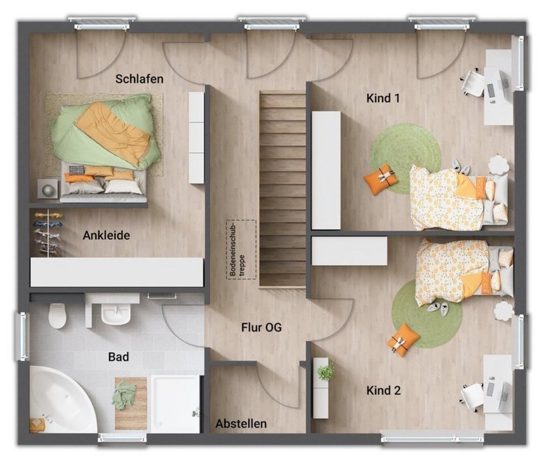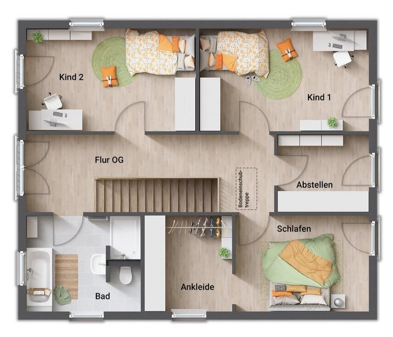 - Eltern- und Kinderbereich im Obergeschoss getrennt durch den Flur
