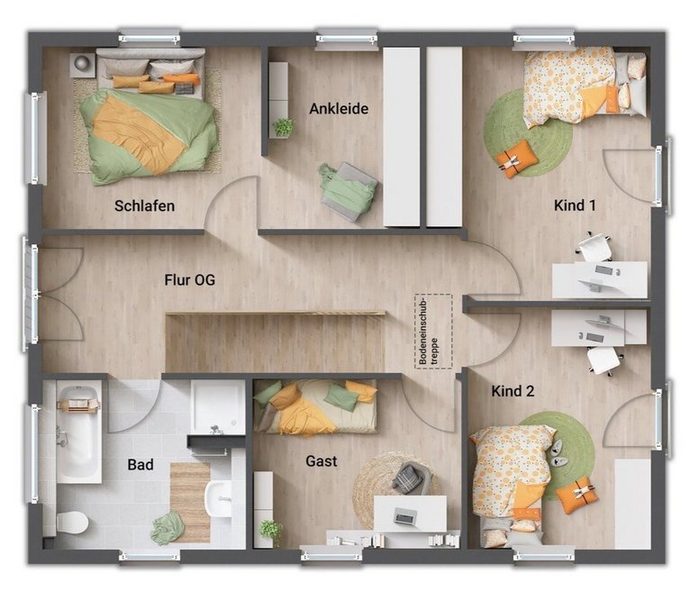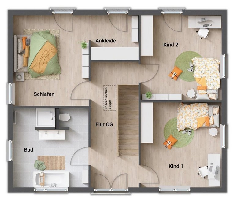 Auch das Obergeschoss zeigt sich im gradlinigen Baustil des Hauses. Hier finden Sie drei Zimmer, die Sie nach Ihren Vorstellungen als Schlaf-, Kinder- oder Gästezimmer nutzen können. Große Fenster lassen auch hier viel Tageslicht hineinströmen. Die Ankleide im Schlafzimmer bietet viel Stauraum.