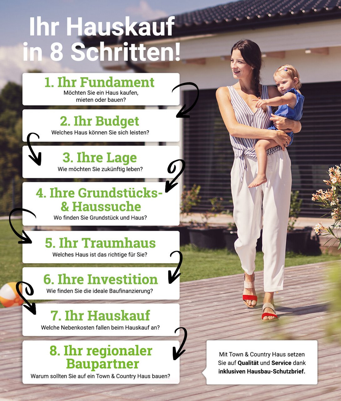 Gehen Sie hier Schritt für Schritt durch, um alle wichtigen Planungsaspekte zielgerichtet zu bearbeiten. Nach der Lektüre und einer Fachberatung durch einen Town & Country Haus Baupartner vor Ort werden Sie viele Aspekte klarer sehen. Sobald alle Fragen beantwortet sind und Antworten bzw. Lösungen vor Ihnen liegen, ist der Weg zum Eigenheim nicht mehr weit. Am Ende dieses Ratgebers finden Sie Tipps zum Thema 'Haus kaufen'. Abgerundet wird der Ratgeber durch FAQs, die aus unserer langjährigen Erfahrung mit mehr als 40.000 gebauten Häusern viele Bauherren beschäftigen.